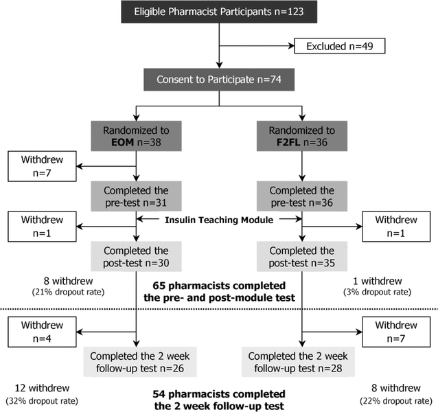 The insulin teaching module was delivered by EOM or F2FL over a 6-week period. The F2FL sessions were conducted at 5 hospital sites, with each participant attending a single session. The EOM participants had 7 days to complete the module once it was made available at each site. Participants completed a pre-module questionnaire to measure baseline knowledge. Immediately after finishing the module, each participant completed a post-module knowledge assessment questionnaire, with the same questionnaire being used for both groups. To evaluate retention of information, a follow-up knowledge assessment questionnaire was administered 2 weeks later. The 2-week period was chosen on the basis of previous studies, which showed that knowledge retention was approximately 50% after 1 week and insignificant after 55 days.14