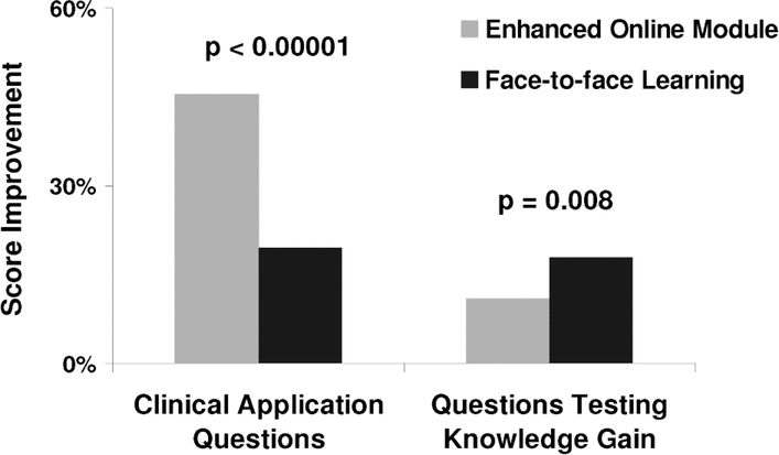 A total of 74 pharmacists consented to participate, 38 randomly assigned to use the enhanced online module and 36 to attend the face-to-face learning session. For questions examining knowledge application, the mean improvement achieved by the online learning group was 26 percentage points greater than that achieved by the face-to-face learning group (95% confidence interval [CI] 25 to 27; p < 0.001). For questions testing knowledge gain, the improvement achieved by the online learning group was 7 percentage points less than that achieved by the face-to-face learning group (95% CI 2 to 12; p = 0.008). Therefore, the enhanced online module was deemed to be non-inferior to the face-to-face learning session in terms of knowledge application and knowledge gain. Insufficient data were available to analyze the secondary outcome of knowledge retention over time. Participant satisfaction was similar for the 2 groups ( p = 0.62).