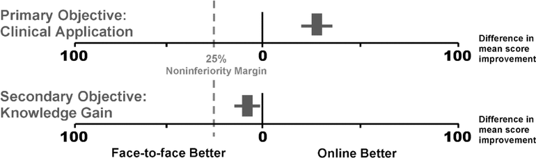 The scenario in which a difference in improvement score falls wholly between the non-inferiority margin and the line of no effect, as in the knowledge gain analysis reported here (see Figure 3), is unusual and emphasizes that questions testing knowledge application must be well crafted to avoid overlap with those testing knowledge gain.18 This type of result usually occurs with very large populations or with non-inferiority margins that are too wide.19 The study population here was not particularly large, but the non-inferiority margin may have been too lenient. However, even if we had reduced the non-inferiority margin by half, to 12.5%, the data would still have fallen wholly within the margin. Even with this reduced margin, we would have concluded non-inferiority of EOM relative to F2FL. More research may clarify the situation further.
