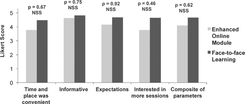 Figure 4. Mean satisfaction scores for various aspects of the learning experience, as graded on a 5-point Likert scale, where 1 = not at all satisfied and 5 = very satisfied. NSS = not statistically significant (Mann–Whitney U test). |