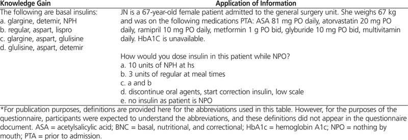 The pre- and post-module knowledge assessment questionnaires were designed by the diabetes pharmacist expert and were directly related to material taught in the BNC insulin modules. The content of the knowledge assessment questionnaires was checked by 2 other diabetes experts for clarity and correctness. Multiple-choice, fill-in-the-blank, and short answer questions were used to test knowledge gain and application of skills. Knowledge gain refers to learning facts about a subject, whereas application of skills refers to the ability to apply the learned facts to hypothetical clinical scenarios. An example of the questions is shown in Table 2. Demographic data, such as years of experience, as well as previous knowledge of insulin dosing were also collected in the pre-module questionnaire. The post-module questionnaire included questions to assess participants’ satisfaction with aspects such as convenience, expectations, information, and interest in further sessions (graded on a Likert scale), as recommended by other studies.1,12,16 The follow-up knowledge assessment used the same questionnaire as the post-module knowledge assessment.