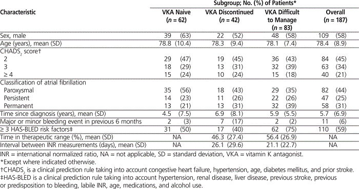 Three patient cohorts were studied: VKA-naive (patients who had never received VKA therapy, despite their clinical situation), VKA discontinued (patients previously exposed to VKA, with duration of therapy longer than 3 months and cessation of therapy less than 12 months before inclusion in the study), and VKA therapy deemed “difficult to manage” (patients who had been receiving VKA therapy for more than 3 months at the time of study inclusion but whose therapy was considered difficult to manage, as per the treating physician’s criteria). Patients were eligible for the study only if their respective primary care physicians indicated that they had nonvalvular atrial fibrillation on the index date of the study and their warfarin therapy was being actively managed by the participating physician. The index date was the day on which the patient’s data were collected. Patients had to be at least 18 years of age, had to be self-administering their medications, and had to be at moderate to high risk of stroke (CHADS 2 score ≥ 2). Demographic and clinical variables collected were age, sex, height and weight, smoking status, presence of comorbidities and concurrent medications, information pertaining to diagnosis and treatment of atrial fibrillation, antithrombotic medication received, and stroke and bleeding events within the previous 6 months. The VKA treatment regimen and monitoring data for international normalized ratio (INR) were recorded for the previous 12 months or from the date of initiation of VKA treatment.