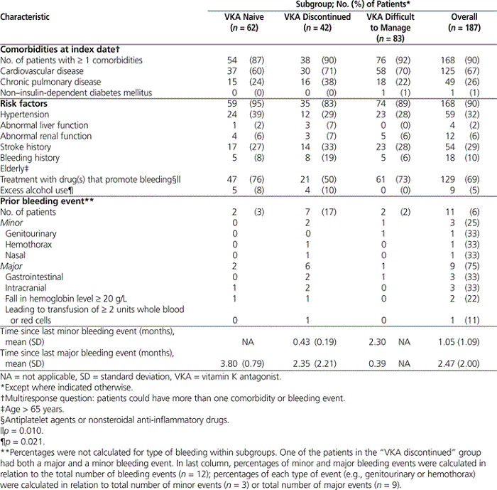 Levels of comorbidity at the index date were similar across the 3 groups, with at least one concurrent condition being reported for 87% (54/62) of VKA-naive patients, 90% (38/42) of those with VKA discontinued, and 92% (76/83) of those whose therapy was difficult to manage (Table 2). The comorbidities were mainly cardiovascular, followed closely by respiratory (Table 2). The population was at high risk of bleeding, with more than half of the patients (110 [59%]) having 3 or more HAS-BLED risk factors (see Table 1) (where HAS-BLED is a clinical rule that accounts for hypertension, renal disease, liver disease, previous stroke, previous or predisposition to bleeding, labile INR, age, medications, and alcohol use). The highest rate of minor and major bleeding events (combined) in the previous 6 months was seen among those who had discontinued VKA therapy (8 events in a total of 7 patients [17% of the sample]) and was heavily weighted to major bleeding events. The VKA-naive group and those whose therapy was considered difficult to manage had 2 bleeding events each (3% and 2% of the sample, respectively).