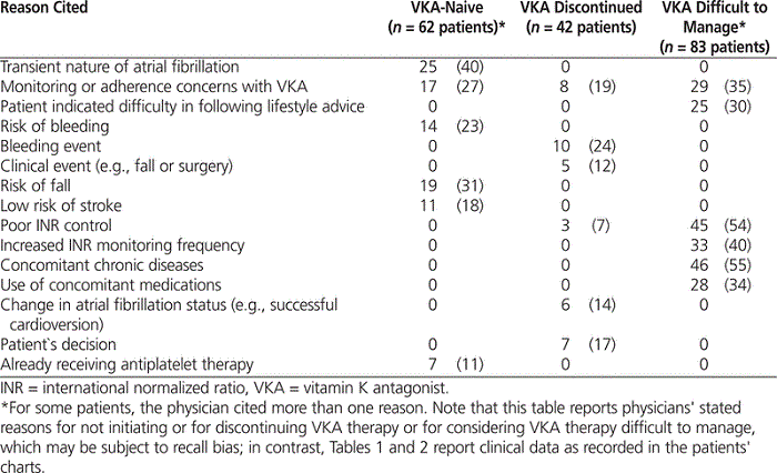 Charts for 187 patients (mean age 78.4 years, standard deviation 8.9 years) treated at 39 primary care sites were reviewed (62 treatment-naive, 42 with therapy discontinued, and 83 whose therapy was considered difficult to manage). Atrial fibrillation was paroxysmal in 82 (44%) of the patients, persistent in 47 patients (25%), and permanent in 58 (31%). One patient in each of the 3 cohorts had experienced a stroke during the 6 months before study participation. Bleeding events were more frequent among patients who had discontinued VKA therapy than in the other 2 groups. Among those whose therapy was discontinued and those whose therapy was difficult to manage, the mean time in the therapeutic range was 46.3% and 56.4%, respectively. The most common reason for not initiating VKA therapy in treatment-naive patients was the transient nature of atrial fibrillation (25/62 [40%]). The most common reason for discontinuation of VKA therapy was a bleeding event (10/42 [24%]). The presence of a concomitant chronic disease was the most common reason that a patient’s therapy was considered difficult to manage (46/83 [55%]).