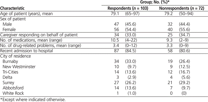 The majority of the patients eligible for inclusion in this evaluation came from Burnaby and Surrey, which together accounted for more than half of both the respondent and nonrespondent groups (Table 2). On average, those who received the MMP service had more than 3 drug-related problems identified by the pharmacist, and the majority of them were seen as a result of recent discharge from hospital.