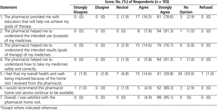 Of the 175 patients invited to participate in the survey, 103 (58.9%) agreed to participate. The majority of respondents agreed or strongly agreed with all of the survey items, indicating satisfaction with the program. For example, 97 (94%) agreed or strongly agreed that they would recommend the pharmacist home visit program continue to be available, and all 103 (100%) agreed or strongly agreed that they were satisfied with the pharmacist home visit. Respondents provided some suggestions for program improvement.