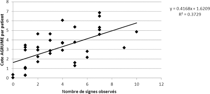 Afin de calculer la relation qui peut exister entre la cote AGRUME par patient et le nombre de signes observés par patient pour le même échantillon aléatoire de 36 patients, nous avons calculé le taux de corrélation et produit une courbe de tendance linéaire sur graphique pour calculer un coefficient de détermination ( R 2), reflétant la présence ou non de corrélation entre les deux variables étudiées.
