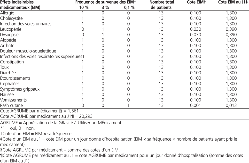 Afin de calculer la cote AGRUME par médicament, nous avons recensé dans l’ouvrage de référence8 tous les EIM potentiels évoqués par médicament. À chaque EIM rapporté avec sa fréquence, nous avons attribué une cote de 0,001, de 0,03 ou de 0,1 selon la catégorie de fréquence rapportée. Les cotes attribuées à chaque EIM attribué à un médicament ont été additionnées afin d’établir la cote AGRUME par médicament.