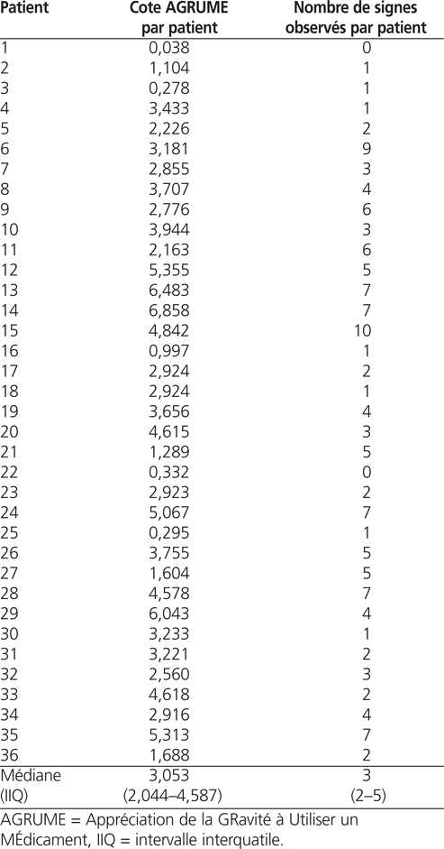 Afin de valider l’outil AGRUME, nous avons procédé à la validation de la cote AGRUME par patient. Pour cela, nous avons établi un échantillon de convenance et aléatoire de 36 dossiers patients hospitalisés pendant une des deux journées d’hospitalisation où la cote AGRUME totale par jour a été calculée. Pour chaque patient, une liste d’EIM potentiels a été établie à partir des médicaments à son profil. À partir de cette liste, un assistant de recherche a consulté les dossiers afin de recenser les signes correspondants à la journée d’observation. Les notes d’évolution médicale, les notes de l’infirmière et les résultats de laboratoire pertinents ont été analysés. Si un signe était présent plus d’une fois, il n’était recensé qu’une seule fois. La standardisation du recensement a été réalisée grâce à une évaluation par deux assistants de recherche des dix premiers dossiers patients.