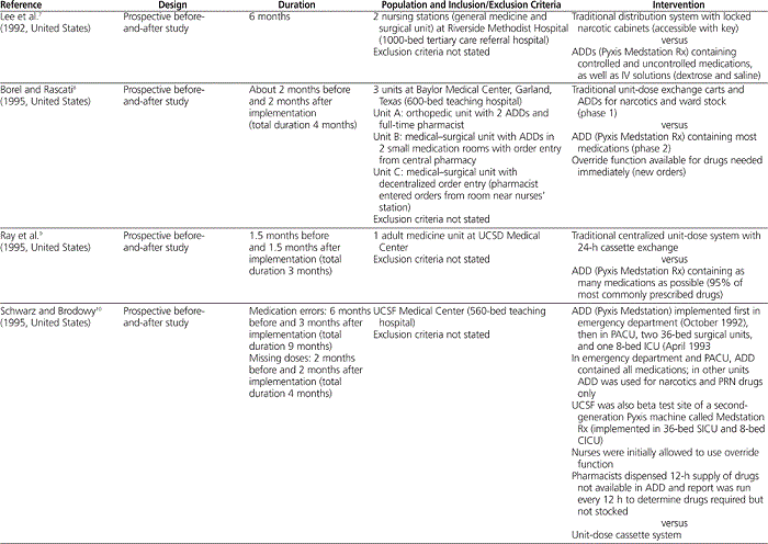 Because the objective of this analysis was to evaluate the benefit of ward-based ADDs relative to traditional manual medication-dispensing processes (including centralized unit-dose systems), studies evaluating pharmacy-based ADDs, such as bar code–based medication dispensing carousels, automated dispensing shelves, and combinations of various automated dispensing modalities, were excluded. Studies comparing one type of ADD with another were excluded, as were those evaluating the same ADD implemented on different hospital wards.