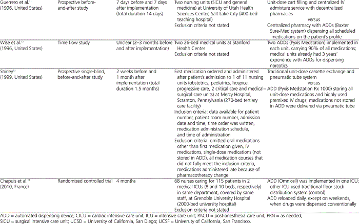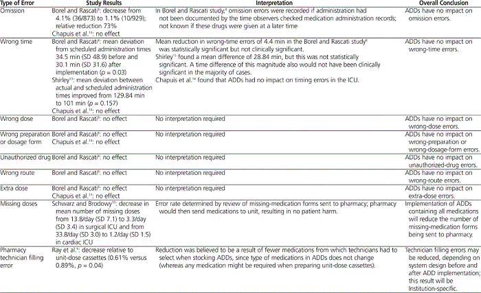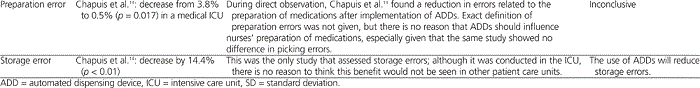Chapuis and others14 conducted a 4-month RCT involving implementation of an ADD in one ICU and usual practice (traditional floor stock drug distribution system) in another ICU (control) within the same department of a 2000-bed university hospital. The primary outcome of this study was total error rate, defined as percent total opportunities for error (calculated by dividing the number of drugs associated with one or more errors by the number of drugs ordered). Secondary outcomes included percent of detailed opportunities for error and percent of storage errors. Detailed opportunities for errors were defined as any gesture or action by a nurse that could result in the following types of errors: (1) picking errors (wrong name, dosage, or pharmaceutical form); (2) preparation errors (wrong dose, solvent type, or volume for reconstitution, or wrong mixtures); (3) administration errors (wrong technique, route, rate, or administration time more than 1 h before or 1 h after the expected time; physicochemical incompatibility); (4) omissions; and (5) extra doses. These authors found that total error rates differed significantly between the control and study units after implementation of the ADD (18.6% versus 13.5%, p < 0.05), whereas no difference was found before ADD implementation. Total error rates in the intervention unit were 20.4% before and 13.5% after implementation ( p < 0.01), a decrease of 6.9 percentage points (compared with a decrease of 0.7 percentage points in the control unit). Wrong-dose errors declined from 3.8% to 0.5% ( p = 0.017); however, no difference was found in picking and administration errors, including wrong-time errors, omission errors, or extra doses given. There were 14.4% fewer storage errors in the study unit than in the control unit ( p < 0.01).