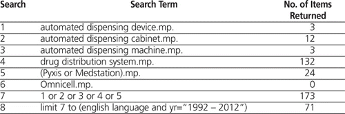 A literature search for the period 1992 to 2012 was conducted within MEDLINE (1946 to present with daily update), Embase (1974 to 2012 week 26), the Cochrane Database of Systematic Reviews (2005 to May 2012), ACP Journal Club (1991 to June 2012), the Database of Abstracts of Reviews of Effects (second quarter 2012), Cochrane Central Register of Controlled Trials (June 2012), Health Technology Assessment (second quarter 2012), and National Health Service Economic Evaluation Database (second quarter 2012) with the following search terms: “automated dispensing device”, “automated dispensing cabinet”, “automated dispensing machine”, “automated dispensing system”, “drug distribution system”, “Pyxis”, “Omnicell”, and “Medstation” (see Appendix 1 for MEDLINE search strategy). The search was limited to English-language articles because the authors did not have the resources to translate or interpret publications in other languages. The reference lists of relevant articles identified by these searches were reviewed manually for additional studies.