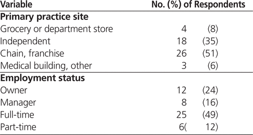 A total of 318 surveys were sent to pharmacists practising in 96 community pharmacies. Fifty-one completed surveys were received (42 by fax, 9 online), for a response rate of 16%. Given the anonymous nature of the survey, data were not available on the number of different pharmacies represented by the returned surveys. Participants were, however, asked to indicate the type of primary practice site.