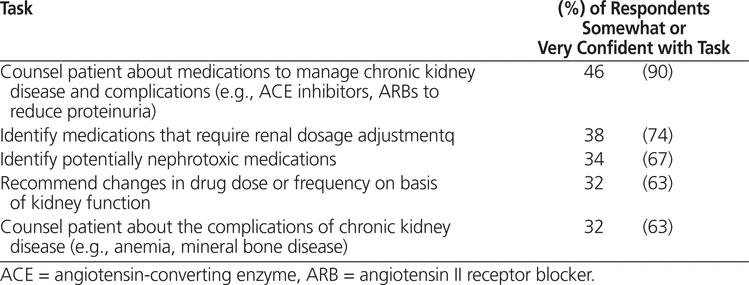 The results of the current survey indicate that respondents are receptive to continuing education about CKD complications and their management. Initial efforts should focus on areas where respondents were least confident, including dosing adjustments for renal drugs and management of CKD complications. Previous research has suggested that education programs aimed at increasing pharmacists’ competency in managing CKD increased the pharmacists’ knowledge and ability to identify and intervene on DTPs. Matzke and others8 described the implementation of a 3-day pharmaceutical care preceptorship program in the nephrology setting. The program was designed for hospital pharmacists working with mostly outpatient nephrology patients in the United States.8 A survey of the participants showed increases in the number of pharmacist interventions and improvements in clinical indicators related to anemia and the management of renal bone disease. In Quebec, a training and communication-network program was designed to facilitate pharmaceutical care by community pharmacists.14 The 6-month pilot project included a 3-h workshop, links to patients’ clinical information from CKD clinic visits, and access to a consultation service run by hospital nephrology pharmacists. Community pharmacists who participated in the program intervened more frequently for DTPs related to inappropriate dosage and inadequate medication use than their counterparts who did not participate. Laboratory test results were found to represent one of the most important sources of information for identifying DTPs, which demonstrates the value of increased access to clinical information.14