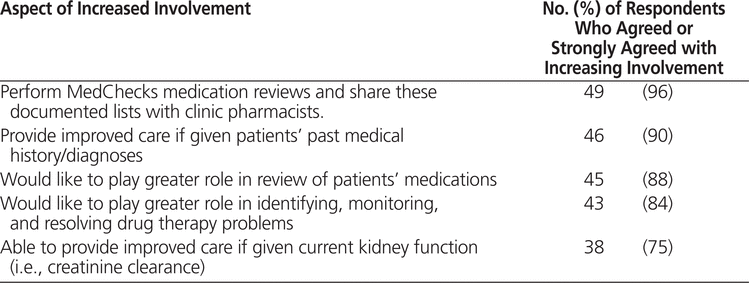 Forty-five (88%) of the pharmacists indicated a willingness to play a greater role in the review of medications for patients with chronic kidney disease. The majority of respondents agreed or strongly agreed that they would be willing to perform Meds -Check medication reviews for CKD patients and share these documented lists with clinic pharmacists (Table 3). However, 11 (22%) of the pharmacists indicated that their current practice would not allow enough time to review patients’ medications.