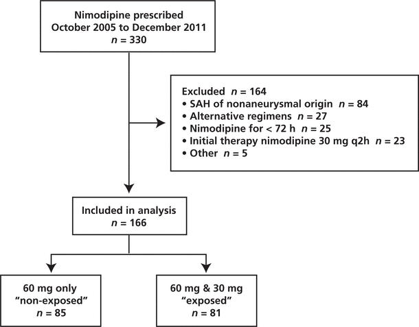 This retrospective cohort study involved patients who were admitted to QEII Health Sciences Centre, Halifax, Nova Scotia, from October 2005 to December 2011 for aSAH and who received nimodipine enterally. The hospital is a 1034-bed adult tertiary care referral and trauma centre and university-affiliated teaching hospital. The study protocol was internally reviewed, and approval was obtained from the Capital Health Research Ethics Board. Informed consent was not required by the institutional review board.