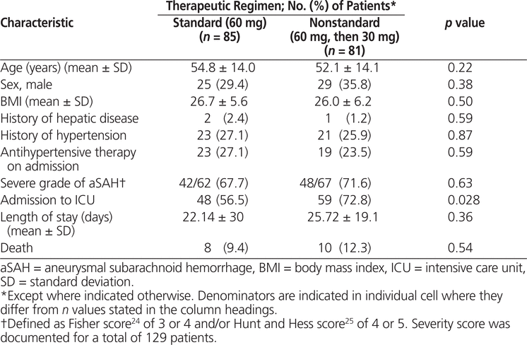 Data for patient characteristics and factors hypothesized to be associated with manipulation of the nimodipine regimen from 60 mg every 4 h (standard regimen) to 30 mg every 2 h (nonstandard regimen) were collected. The investigators included 2 critical care clinicians (a physician and a clinical pharmacy specialist [R.G. and S.K.G., respectively]) who frequently manage patients with aSAH. The choice of factors was based on a literature review and discussion within the investigative team, which led to a consensus on the following clinically relevant factors: age, sex, blood pressure (mean 24-h systolic blood pressure from 48 to 72 h after initiation of nimodipine), admission to the intensive care unit (ICU), occurrence of vasospasm at any time during nimodipine therapy, exposure to vasopressor therapy (norepinephrine or dopamine) at any time during nimodipine therapy, severe-grade aSAH (Fisher score 3 or 4 [for classifying appearance of subarachnoid hemorrhage on CT24; range 1 to 4] and/or Hunt and Hess score 4 or 5 [for classifying surgical risk25; range 1 to 5]), antibiotic exposure at any time during nimodipine therapy, and positive results on microbiology culture at any time during nimodipine therapy.16–19 The time frame for capturing blood pressure was chosen because nimodipine reaches steady state at about 48 h. Mean blood pressure over a 24-h period, rather than incident variations or extent of variations in blood pressure, was chosen primarily because the retrospective design of the study prevented investigation of alternative reasons for incident variations. In addition, clinicians may be less likely to change a dosage regimen on the basis of one isolated finding in a population that undergoes hourly blood pressure monitoring. Typical management of low blood pressure in this patient population may involve alternative strategies such as volume resuscitation; therefore, consistently low blood pressure, refractory to alternative interventions, was considered more meaningful because of its likelihood to prompt a change in therapy.18
