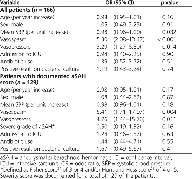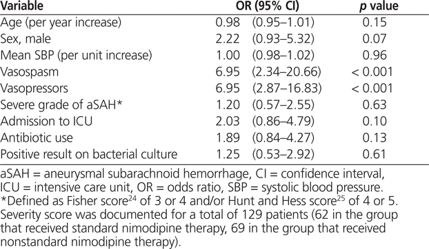 A total of 166 eligible patients were identified. For all of these patients, nimodipine 60 mg every 4 h was prescribed initially. Subsequently, 81 (49%) of the patients were switched to nimodipine 30 mg every 2 h, whereas 85 (51%) continued on the original dosage (nimodipine 60 mg every 4 h) for the duration of their treatment. Multivariate analysis revealed that occurrence of vasospasm (odds ratio [OR] 5.30, 95% confidence interval [CI] 2.08–13.47; p < 0.001) and exposure to vasopressor therapy (OR 3.29, 95% CI 1.27–8.50; p = 0.014) were associated with increased odds of receiving the nonstandard nimodipine regimen.