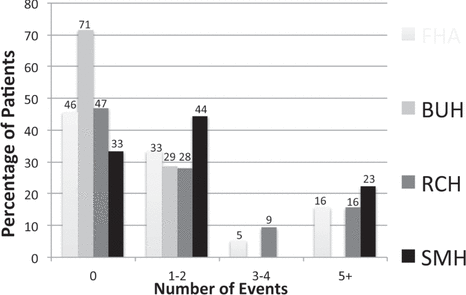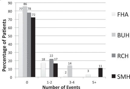 Figure 3. Incidence of bradycardia at 3 sites (individually and combined) during dexmedetomidine therapy. FHA = Fraser Health Authority, BUH = Burnaby Hospital, RCH = Royal Columbian Hospital, SMH = Surrey Memorial Hospital. |
