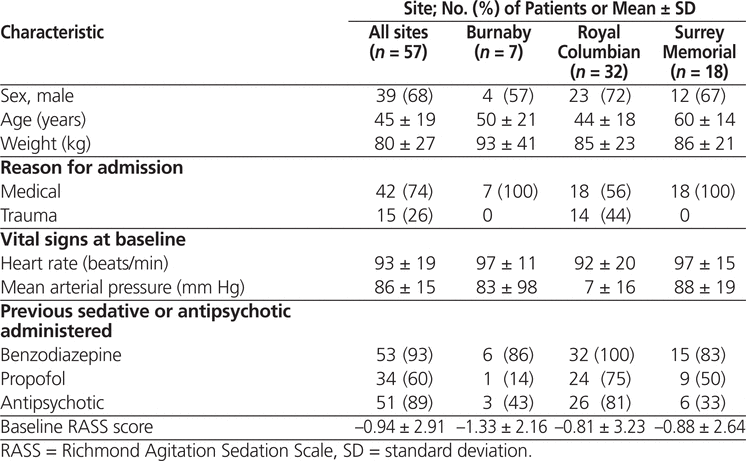 In total, 57 patients were identified as meeting the inclusion criteria over the 23-month study period. Of these, 7 patients received dexmedetomidine at Burnaby Hospital, 32 patients at the Royal Columbian Hospital, and the remaining 18 at Surrey Memorial Hospital. Patient demographic and baseline clinical characteristics are presented in Table 1.