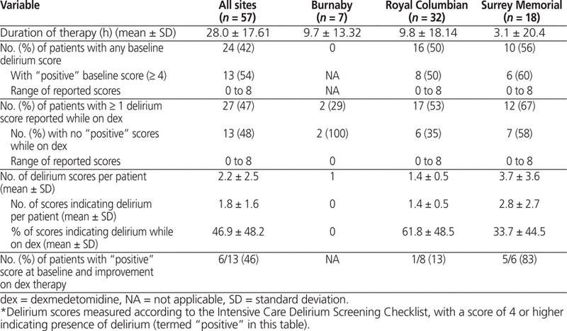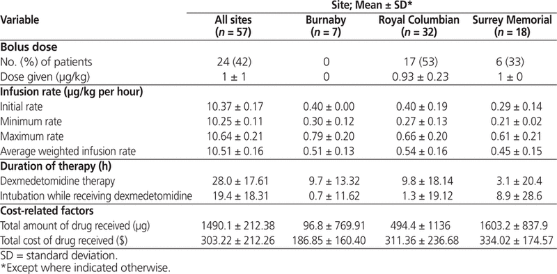 This study was performed at 3 clinical sites located within a single health authority. The study was undertaken to provide insight into the use of dexmedetomidine for sedation in the ICU settings at each of the 3 sites and to compare these uses with usage as recommended in the product monograph. Developing this type of data for this particular drug may be useful for formulary review and consideration or for future medication-use evaluation projects, as the drug was not on the institution’s formulary at the time of the study. Because of its nonformulary status, there was an element of unfamiliarity with dexmedetomidine use at the time the study was designed, and it was decided to use a cost–benefit approach to examine how the drug was used and potential ramifications, with comparison to directions for use as presented in the product monograph. The inclusion of 3 sites represented an attempt to increase the amount of data for the analysis (given restricted use of the drug at the time) and to reflect practice within the health authority as a whole, accounting for differences in perspectives and interpretations of recommended guidelines for use and prescribing variability among individual practitioners.