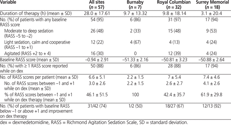 Following receipt of ethics approval, a list of patients who had been treated with dexmedetomidine in the ICU between January 1, 2011, and November 30, 2012, at each of the 3 sites was generated by the Pharmacy Department’s computer system. Patient records were scanned by the electronic medical record system to ensure that patients met the following inclusion criteria: adult patients (18 years of age or older) with admission to the ICU at 1 of the 3 specified sites, and receipt of dexmedetomidine for sedation. Data were collected and recorded by the primary author (K.B.) and a research assistant (E.A.).