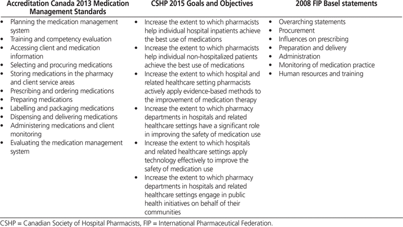 The differences noted between the Accreditation Canada 2013 medication management standards, the CSHP 2015 goals and objectives, and the 2008 FIP Basel consensus statements reflect the different focus of each organization in relation to hospital pharmacy practice. Whereas the Accreditation Canada standards stem from an organization-wide approach to ensuring a safe, high-quality medication management system, CSHP 2015 focuses solely on the role of hospital pharmacists. FIP provides a more global view by identifying medication safety initiatives at the national, regional, hospital, and pharmacist levels. Despite these differences in perspective, common themes emerged around the role of the pharmacist in providing safe, high-quality care. This information may assist hospital pharmacies in priori-tizing their efforts to achieve the common standards, goals and objectives, and statements from these various organizations, representing a common vision for hospital pharmacy practice and excellence in patient care.