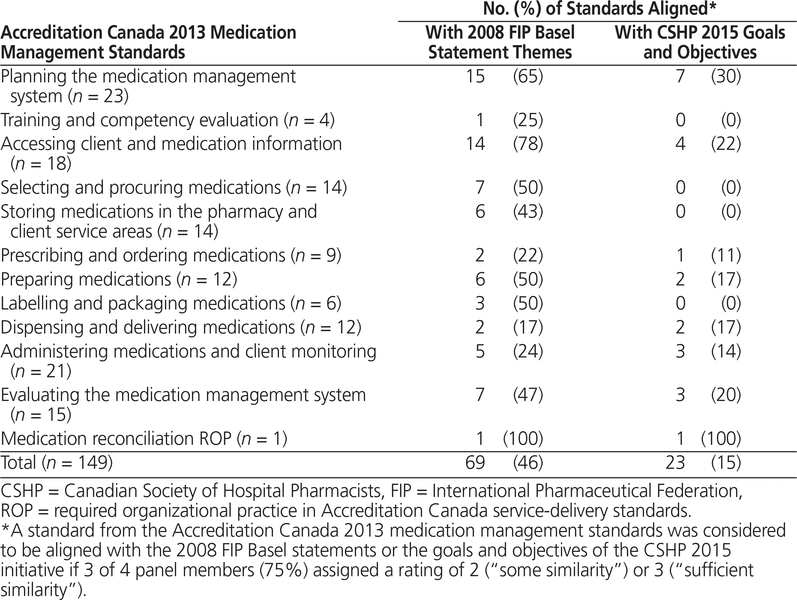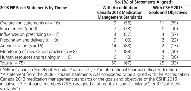About half of the Accreditation Canada standards and the CSHP 2015 objectives were aligned with at least one FIP Basel statement (46% and 58%, respectively). The 58% alignment of CSHP 2015 objectives with FIP consensus statements is similar to the 53% reported in the previous CSHP crosswalk.15 All of the Accreditation Canada themes had at least one criterion that aligned with the FIP Basel statements. However, the FIP Basel statements did not cover the CSHP 2015 objectives for involvement of pharmacists in public health initiatives, as these are not within the scope of the hospital pharmacy section of the FIP Basel statements. Instead, public health initiatives are addressed in the joint FIP and World Health Organization guidelines on good pharmacy practice.18