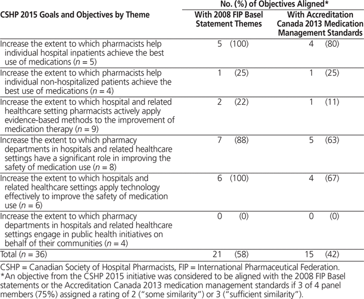 Sixteen (44%) of the 36 CSHP 2015 objectives were initially aligned with one or more of the Accreditation Canada criteria. Of these 16 objectives with initial alignment, 15 (94%) achieved 75% agreement (i.e., some or sufficient similarity) with at least one Accreditation Canada criterion. Overall, 15 (42%) of the 36 CSHP objectives were classified as being aligned with one or more of the FIP Basel statements.