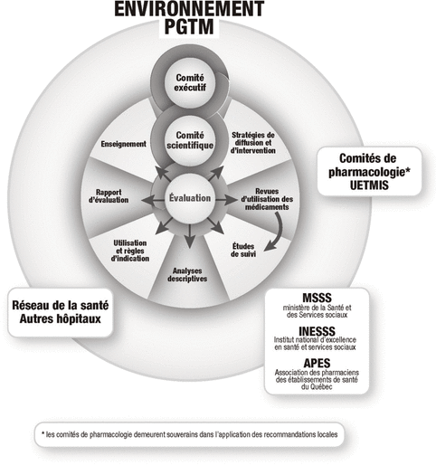 Finalement, le PGTM collabore avec des d’organismes provinciaux reconnus, tels l’Institut national d’excellence en santé et en services sociaux, l’Association des pharmaciens en établissement de santé et le Comité de l’évolution de la pratique en oncologie. Le PGTM a collaboré avec ces organismes à la création de guides de pratique11 favorisant une optimisation de la thérapie et à l’élaboration d’activités de formation continue12,13. Le PGTM participe également aux travaux de certaines unités d’évaluation des technologies et des modes d’intervention en santé présentes dans les CHU14.