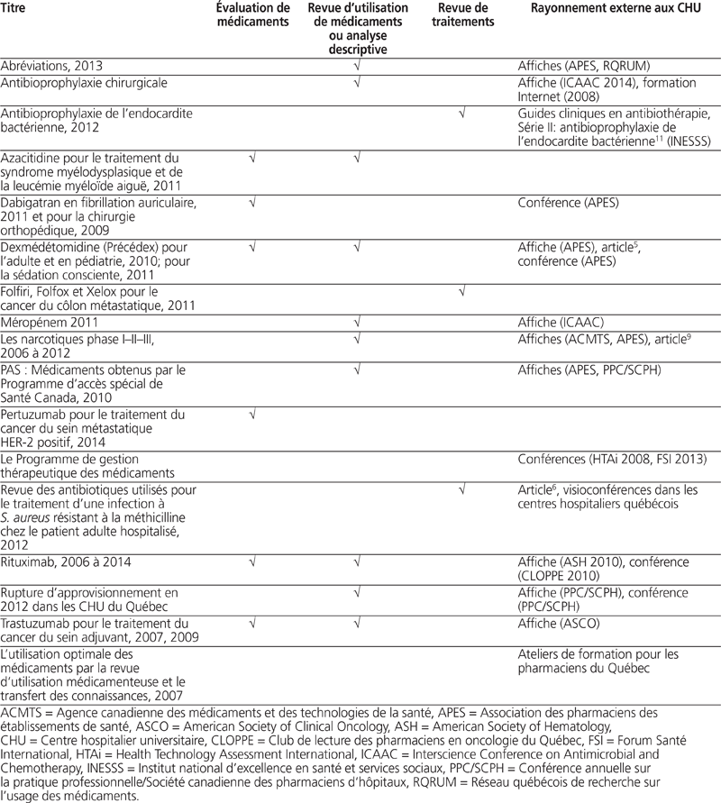 Exemples de travaux effectués par le Programme de gestion thérapeutique des médicaments depuis sa création