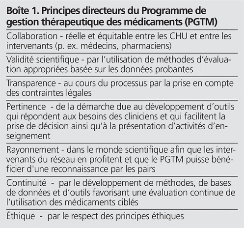 Le PGTM est un programme provincial regroupant des médecins et des pharmaciens de chacun des CHU, dont le but est de favoriser l’utilisation optimale des médicaments dans leurs établissements. Pour le PGTM, la gestion thérapeutique se définit comme une approche systématique d’évaluation des médicaments permettant d’envisager leur ajout aux différentes listes locales et allant jusqu’à la mesure de leurs effets sur des groupes de patients. La gestion thérapeutique intègre des revues systématiques de la littérature médicale ainsi que des recherches évaluatives sur les pratiques entourant l’utilisation des médicaments, sur la mesure des retombées des interventions réalisées et également sur les coûts des soins de santé. La gestion thérapeutique vise également le développement d’outils d’aide à la décision, l’élaboration de méthodes d’intervention ainsi que la diffusion de l’information auprès des cliniciens en plus d’assurer une vigie des thérapies émergentes. Les principes directeurs du PGTM sont énumérés dans la boîte 1.