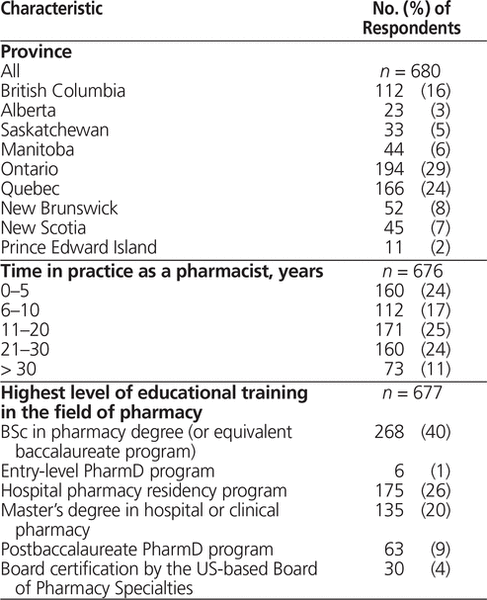 A total of 680 front-line pharmacists responded to the front-line survey. The total number of front-line pharmacists who received the invitation to participate from their pharmacy manager or director is unknown, so a response rate could not be calculated. However, the 680 respondents who responded to the survey represent about 12% of the total number of hospital pharmacists in Canada, according to the Canadian Pharmacists Association’s estimate of 5600 hospital pharmacists in Canada at the time of the survey.1 An examination of the data in Table 1 suggests that the proportion of respondents in each province, in each grouping of years of practice, and in each level of education is consistent with overall numbers of pharmacists and what is known about the hospital pharmacy workforce in Canada.2