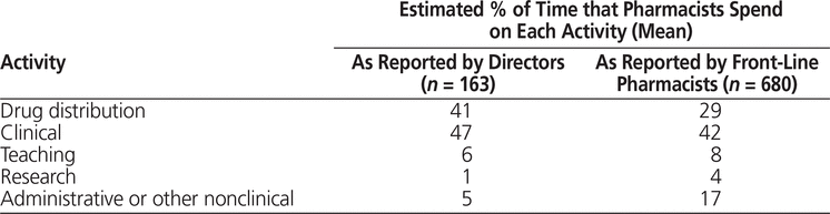 Some questions were posed in the surveys for both front-line pharmacists and directors, to allow a comparison of the responses of these groups. Table 2 compares the responses of directors and front-line pharmacists to a question about the percentage of time that front-line pharmacists spend performing 5 different pharmacy activities: drug distribution, clinical activities, teaching, research, and administrative or non–patient care activities. Interestingly, front-line pharmacists and directors appeared to have somewhat different perceptions of the time spent performing certain activities. On average, the pharmacists estimated that they spent 17% of their time performing administrative and other non–patient care activities, whereas pharmacy directors estimated that pharmacists in their departments spent only 5% of their time performing those activities. Conversely, directors estimated that pharmacists spent 41% of their time performing drug distribution activities, whereas front-line pharmacists estimated that these activities took 29% of their time. For the other practice activities (clinical, teaching, and research) the estimates of pharmacists and directors were reasonably similar (Table 2).