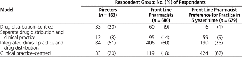 The survey presented definitions for 4 different pharmacy practice models (Table 3). Front-line pharmacists were asked which pharmacy practice model best described the one in which they were working, and which model they thought that their pharmacy department should strive to have in place 5 years in the future. Overall, a large percentage of respondents wanted their pharmacy to adopt a clinical practice–centred model (Table 4). Only 18% (119/680) of front-line pharmacists reported that they were currently practising in a clinical practice–centred model, but 62% (424/679) thought their organization should strive to have such a model in place by 5 years in the future. Although 60% (406/680) of respondents indicated that they were currently practising in a model that integrated drug distribution and clinical practice, only 28% (190/679) thought that their pharmacy should be striving to have such a model in place in 5 years. Only 1% (6/679) of front-line pharmacists thought that their pharmacy should be striving to have a drug distribution–centred model in place in 5 years. The percentage of respondents reporting that their pharmacy was currently operating under a drug distribution–centred model was higher among directors than among front-line pharmacists (20% [33/163] versus 9% [60/680]).