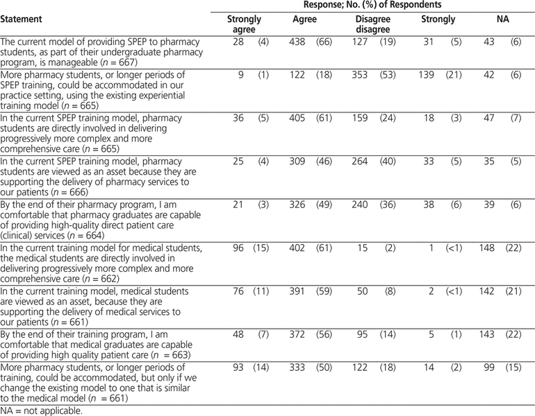 Although 70% (466/667) of respondents to this survey agreed or strongly agreed that the current model of SPEP training was manageable, 74% (492/665) disagreed or strongly disagreed with the statement that “more pharmacy students, or longer periods of SPEP training could be accommodated using the existing SPEP model” (Table 5). However, 64% (426/661) of respondents agreed or strongly agreed that more pharmacy students could be accommodated in their SPEP program if the training model were changed to one more like the medical SPEP model.