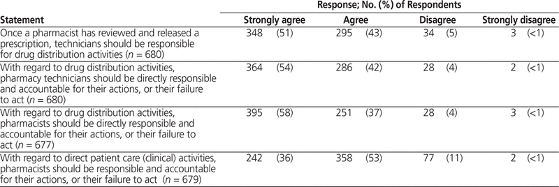 The results of this survey suggest that front-line pharmacists are supportive of the change toward regulation of pharmacy technicians (Table 6). Ninety-six percent (650/680) of front-line pharmacists who responded agreed or strongly agreed that pharmacy technicians should be responsible and accountable for all drug distribution activities that occur after a pharmacist has reviewed the prescription and authorized it to be filled.