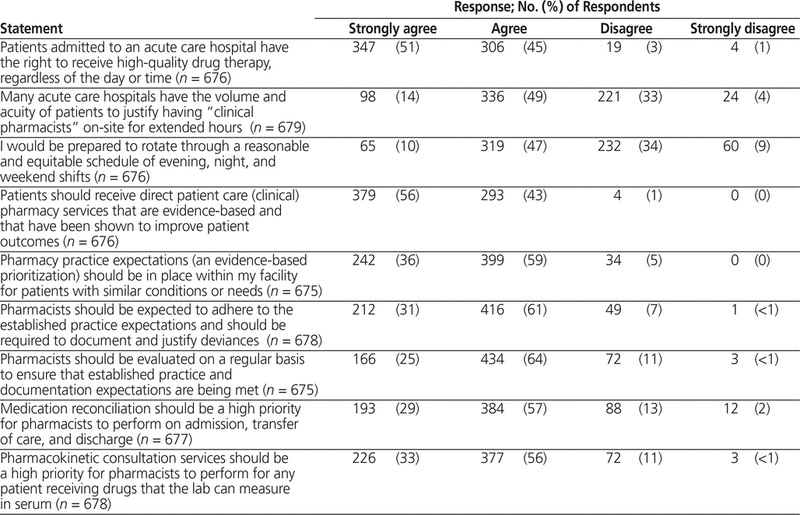 Ninety-seven percent (653/676) of front-line pharmacists who responded to the survey agreed or strongly agreed that patients admitted to an acute care hospital have the right to receive high-quality drug therapy, regardless of the day or time (Table 7). Sixty-four percent (434/679) of respondents agreed or strongly agreed that many acute care hospitals have the volume and acuity of patients to justify having pharmacists available on-site for extended hours, but only 57% (384/676) were prepared to rotate through a reasonable and equitable schedule of evening, night, and weekend shifts to provide such extended hours of service. Ninety-nine percent (672/676) of respondents agreed or strongly agreed that pharmacy services should be evidence-based, and 95% (641/675) agreed or strongly agreed that evidence-based pharmacy practice expectations should be in place within their hospital. Ninety-three percent (628/678) of respondents agreed or strongly agreed that pharmacists should be expected to adhere to established practice expectations and should be required to document and justify deviances from those expectations. Eighty-nine percent (600/675) of respondents agreed or strongly agreed that pharmacists should be evaluated regularly to ensure that practice and documentation expectations are being met.