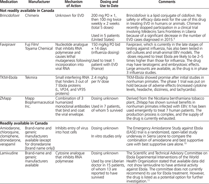 As of early spring 2015, no medications had been approved for the prevention or treatment of EVD.6,7 Supportive care may allow time for the development of adequate antibody response. Administration of IV fluids, replacement of electrolytes, treatment of concurrent infections and secondary bacterial infections, nutritional support, administration of antinauseants and analgesics, and management of bleeding are essential aspects of care for those with EVD.6 As clinical trials are conducted, investigational treatments for EVD may play a larger role. Investigational medications include brincidofovir, favipiravir, TKM-Ebola, ZMapp, amiodarone, chloroquine, clomiphene, dronedarone, lamivudine, and verapamil (Table 2).6,7 Therapies based on blood products obtained from convalescing EVD patients and vaccines, including the VSV-EBOV vaccine developed by the National Microbiology Laboratory of the Public Health Agency of Canada, are also being assessed for their potential use in treating and preventing EVD.6