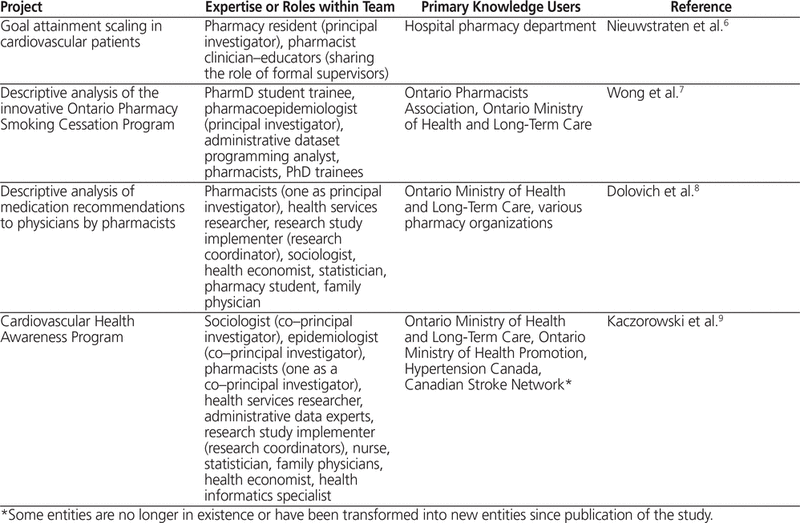 A research team will often consist of a principal investigator (PI) or program leader, co-investigators, collaborators, research staff, administrative support, and trainees. It is also becoming common for teams to encourage the active participation of know -ledge users as research team members. Some examples of research team members are provided in Table 1,6–9 including examples of knowledge users. A pharmacist who is a full-time university professorial appointee or a part-time appointee (as clinician–educator or clinician–scientist) or an institutional (e.g., hospital, long-term care) employee can usually also assume the role of PI on a research study. Local institutional requirements vary, so it may be helpful to verify these requirements before progressing far along in the development of a research project. Most pharmacists working in hospital, community, primary care, or long-term care practice can participate on a research team in some manner, including as a co-investigator or collaborator.