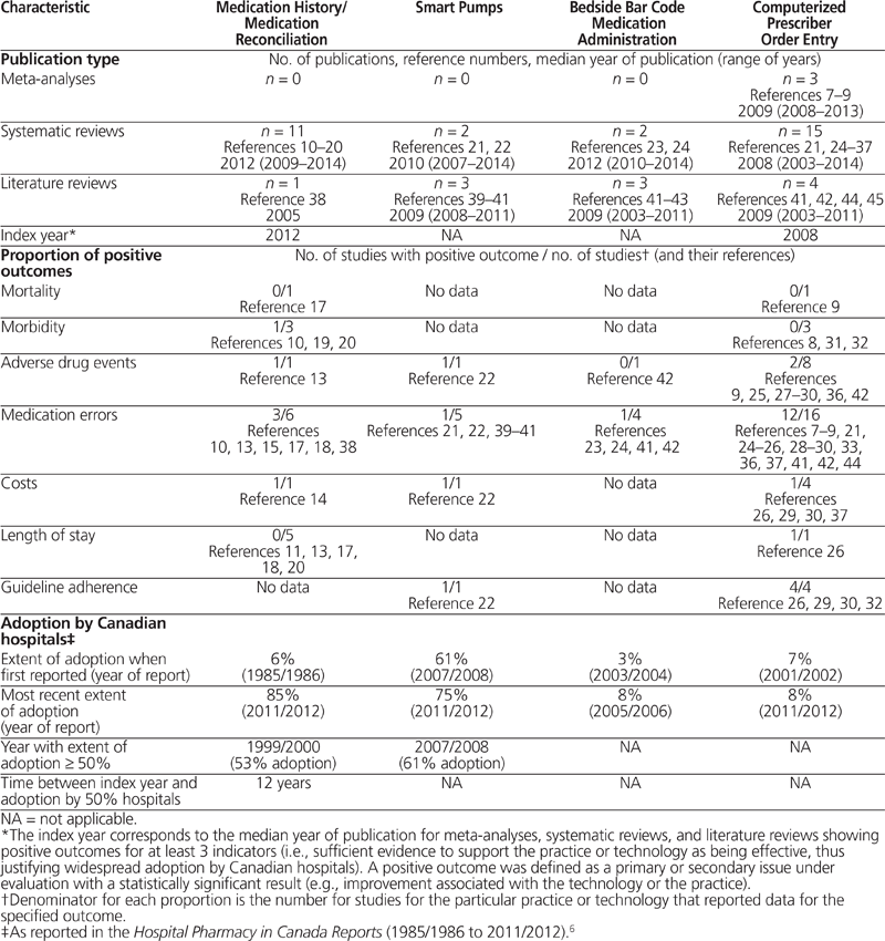 Table 1 summarizes the published evidence7–45 and the extent of adoption of the 4 pharmacy practices and technologies in the drug-use process in Canada. Three meta-analyses and 15 systematic reviews about CPOE were found. No meta-analyses were found for the 3 other practices. There were 11 systematic reviews of medication history/reconciliation, 2 related to smart pumps, and 2 related to bedside bar code medication administration. The proportion of studies with positive results on the specified outcome measures was variable. According to the HPC Report, medication history/reconciliation and use of smart pumps were the most widely adopted practices in 2011/2012.