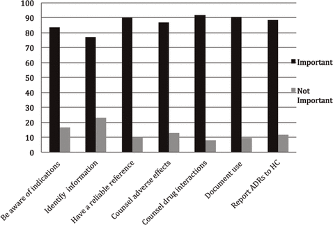 The ability to counsel others about possible drug interactions was most commonly reported as an important professional role for pharmacists (678/738 [91.9%]). Other professional roles presented in Figure 3 were also considered important by large percentages of respondents (83.7%–90.3%).