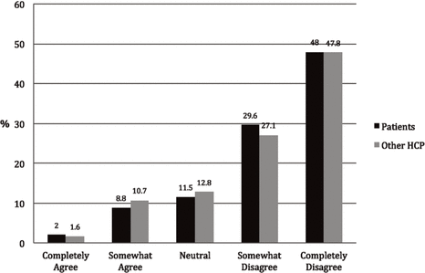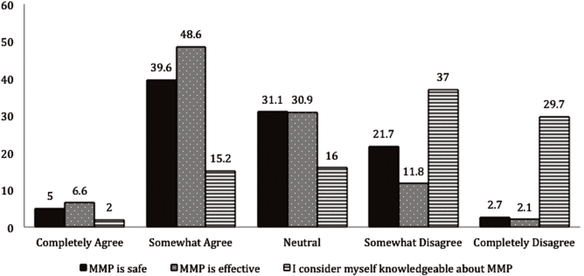 About two-fifths (296/747 [39.6%]) of respondents somewhat agreed that MMP is safe, and almost half (362/745 [48.6%]) somewhat agreed that it is effective (Figure 4). However, two-thirds (499/748 [66.7%]) of respondents disagreed (somewhat or completely) that they were knowledgeable about MMP (Figure 4), and about half completely disagreed that they were comfortable providing advice to patients (48.0%) or health care professionals (47.8%) regarding the use of MMP (Figure 5).