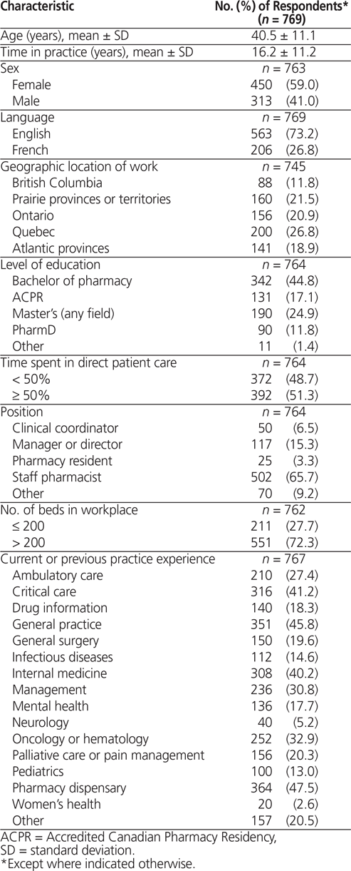 A total of 769 valid survey responses were received (Figure 1). Based on the 2015 pharmacist statistics of the National Association of Pharmacy Regulatory Authorities21 and excluding Alberta, which does not make such statistics available, this sample represents about 13% of hospital pharmacists in Canada. However, representation from 10 provinces and 2 territories was achieved (Table 1). Respondents had a mean age of 40.5 years (standard deviation [SD] 11.1 years) and had been practising for an average of 16.2 years (SD 11.2 years). More women than men completed the survey (450/763 [59.0%] versus 313/763 [41.0%]), which is consistent with the population of pharmacists in Canada.22 Most respondents had a Bachelor of Science in Pharmacy (342/764 [44.8%]) or a master’s degree (190/764 [24.9%]). The majority of respondents were staff pharmacists working in hospitals with more than 200 beds.