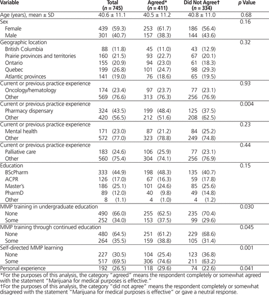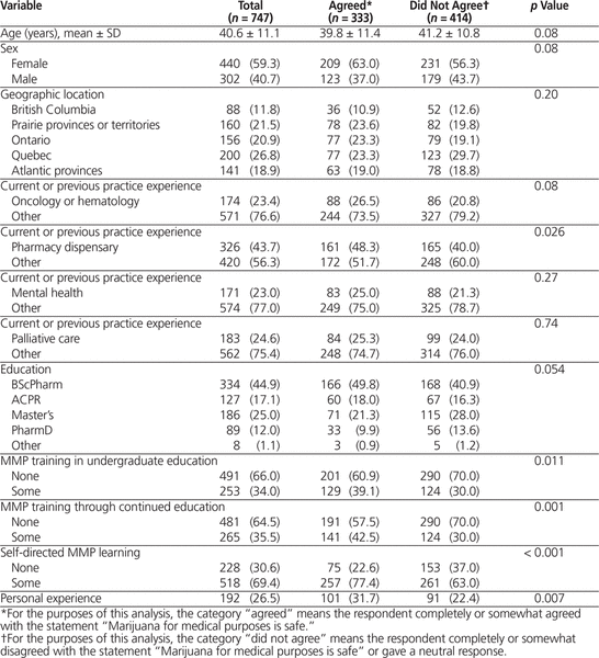 Associations between demographic factors and each of the 3 outcomes were tested. The demographic factors of interest were age, sex, province of work, current and previous practice areas, level of education, MMP-related education, and personal experience (defined as having one’s own prescription for MMP or knowing someone either personally or professionally with a prescription for MMP). Associations between each of the outcomes and categorical variables were assessed with χ2 tests, whereas associations with continuous variables were examined with t tests.