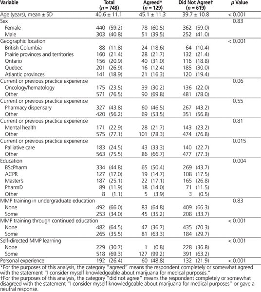 Respondents who agreed that they were knowledgeable about marijuana were more likely to be older, to be from Ontario, to have prior marijuana-related training or education, to work in palliative care, to have a Bachelor of Science in Pharmacy or a PharmD degree, or to have personal experience with marijuana. Respondents from Quebec were the least likely to agree that they were knowledgeable about marijuana.