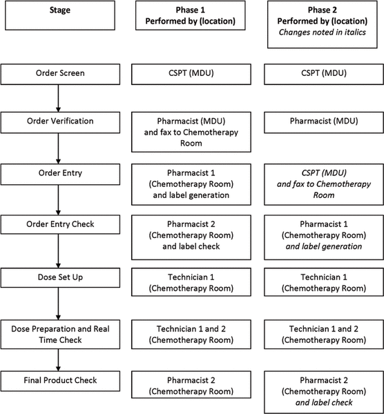 Before the process change, chemotherapy orders for Capital Health were entered, prepared, and checked in a centralized chemotherapy room with 2 biological safety cabinets staffed by 3 pharmacy technicians and 2 oncology pharmacists (see Figure 1). All MDU chemotherapy orders were first screened by the CSPT in the MDU, and the MDU pharmacist then verified that the order was appropriate for the patient and faxed the order to the chemotherapy room. One oncology pharmacist entered the chemotherapy order, and the second oncology pharmacist performed the order-entry check. Two pharmacy technicians set up and prepared the chemotherapy doses, and the second pharmacist was also responsible for checking the final product. After the process change, the CSPT screened the order, and the MDU pharmacist verified that it was correct for the patient. The CSPT then entered the order in the computer in the MDU and faxed the order to the chemotherapy room. The first oncology pharmacist checked the order entry and printed labels, and the second oncology pharmacist checked the final product and label. The new process was thought to improve workflow and safety by allowing chemotherapy orders to be entered in a quiet, dedicated area in the MDU, where patient information was readily available, and by having the 2 oncology pharmacists in the chemotherapy room perform independent checks of the order. Stages that were not affected by the process change were order screening, verification, dose set-up, dose preparation, and final product check, and these were not evaluated for this study.