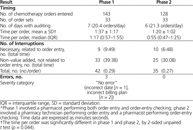 The Embase and PubMed databases were searched, with no restrictions on language or date of publication, using the terms “clinical support pharmacy technician” and “chemotherapy order entry” (as separate searches). These searches yielded no other studies that evaluated chemotherapy order-entry times with which to compare the results of the current study. Furthermore, the absolute measurements from the current study may not be meaningful, because they are dependent on the small sample size and local factors such as the institution’s pharmacy information system, staff training, and complexity of the medication regimens.