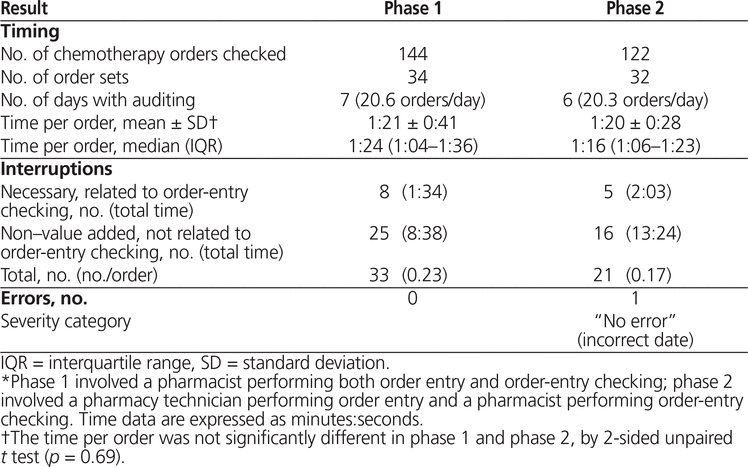 In phase 1 (before the process change), data were collected over 7 nonconsecutive days in November 2011 during pharmacist order entry by the traditional method. Data collection for phase 2 (after the process change) took place over 6 nonconsecutive days in May and June 2012, about 2 months after the CSPT had completed training and certification for order entry. These dates were chosen to allow for a variety of staff to be audited and, in phase 2, for the CSPT to become experienced with order entry. The staff (several pharmacists, one CSPT) who participated in the timing studies all had at least 5 years of experience in an oncology setting. Time-and-motion studies were used to measure the time for a pharmacist or a CSPT to enter an order or check order entry; interruptions and errors that were discovered during order processing were documented during these same time-and-motion studies. Industrial engineering students performed the time-and-motion measurements using a personal digital assistant with UMT Plus time study software (Laubrass, Montréal, Quebec), which was customized to the data collection needs of the study. One student spent time with pharmacy staff to develop and pilot the data collection tool, to ensure it worked smoothly, and made revisions as necessary. The student documented the timing procedures and then used the data collection tool to record the data during phase 1. A second student reviewed the timing procedures, spent time with pharmacy staff to become familiar with the workflow, and practised using the personal digital assistant before recording data in phase 2. The students worked on this project during a 4-month internship program, so the same student was not available for both phases of the study.