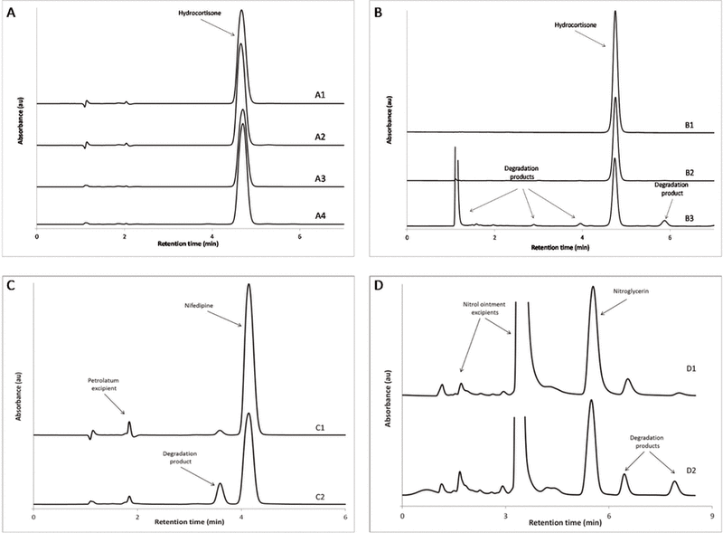 Figure 1. Representative chromatograms from stability studies of preparations used to treat anal fissures. A: Hydrocortisone preparations in petrolatum and cream base initially (A1 and A2, respectively) and after heating at 80°C for 3 days (A3 and A4, respectively). B: Hydrocortisone standard solution prepared in mobile phase at 50 µg/mL (B1); hydrocortisone sample degraded with hydrochloric acid 1 mol/L (50 µg/mL before degradation, B2); and hydrocortisone sample degraded with hydrogen peroxide 3% (50 µg/mL before degradation, B3). C: Nifedipine preparation in petrolatum initially (C1) and after heating at 80°C for 3 days (C2). D: Nitroglycerine preparation in petrolatum initially (D1) and after heating at 80°C for 3 days (D2). |